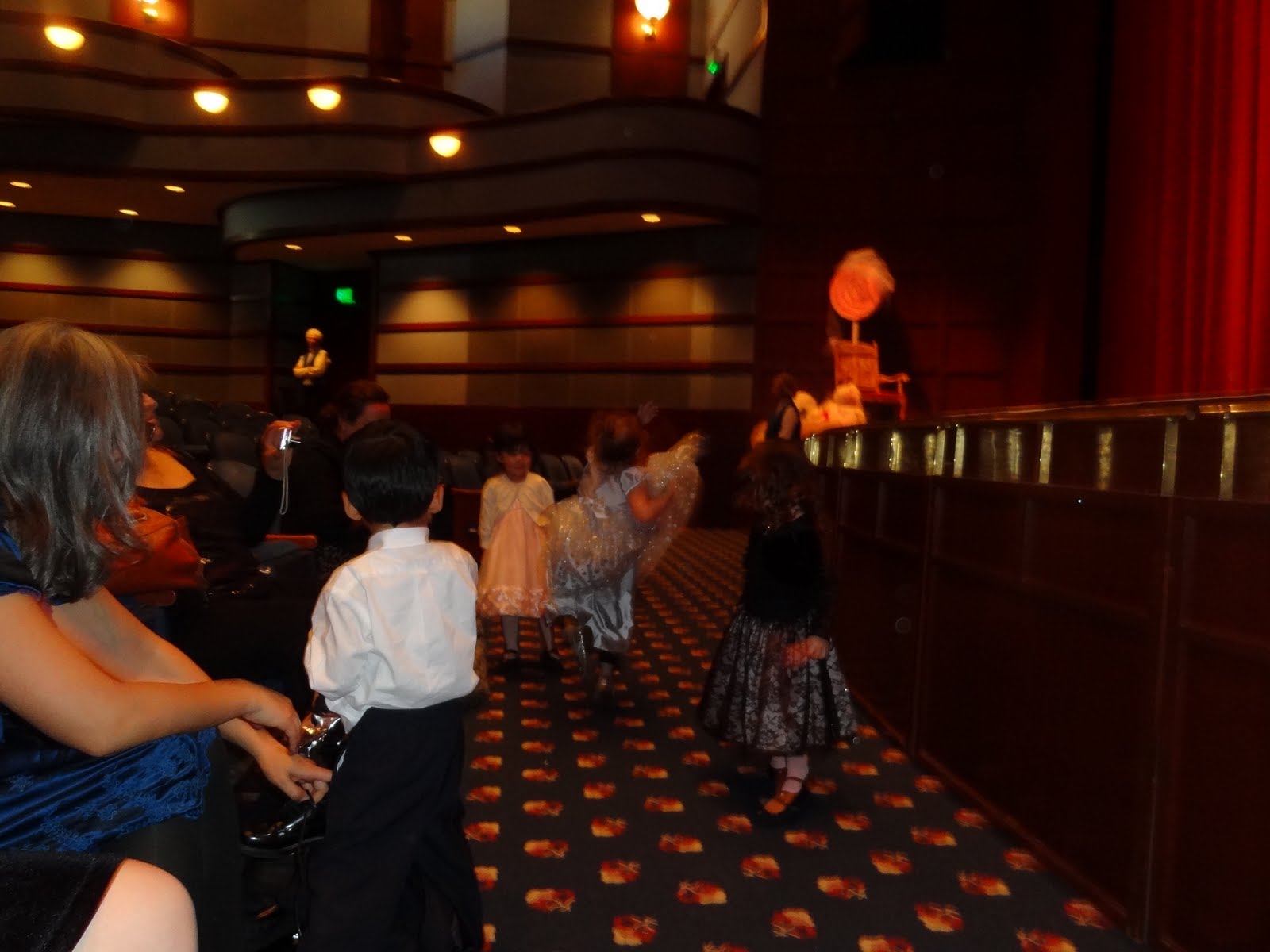 So I did a lot of prep work. We watched several video's on Youtube which gave her an idea of what the show was like and what to expect. i then warned her there would be a curtain and it would open and the show would start. I told her she would have Blankie if she was scared and if it was loud she would have her head phones. I told her a little about the story and that the Christmas tree would be growing. The show was in a fancy theatre at the Lesher performing Arts Center in Walnut Creek but it was an afternoon special for a Homeschooling group and we ended up paying only $14.50 a ticket so it was a small enough amount that I prepared myself to have to leave if needed. We were also going with a friend Joaquin that Holly was excited to see. Originally I was going to go early and talked to the house management about letting us in to familiarize her with the stage, but then decided that the wait before the show started my cause even more anxiety.