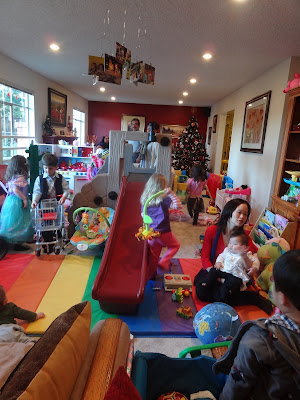 On New Year's day we attended a party at Chloe's house. All of our friends were there and it was so much fun. Holly dressed up in a New Year's dress, but of course it didn't take long before she transformed into a fairy princess. It was cool to get to play with all of Chloe's new Christmas toys and see all of the holiday decorations. It was a pot luck and the food was delicious. The kids had a great time playing in the back yard too. It was also fun to see friends that we don;t see very often. Like Ruby. She was a hoot. Since we last saw her she has really blossomed and was not as shy as before, she has a great sense of humor and was talking a lot. It is really neat watching all of the kids grow up. Sometimes you don;t notice the changes when you see each other often, but then when you see others only every few months you are reminded how much older all of them are getting. We reflected back to the party last year and so much has changed. It was so fun to ring in the New Year with great friends and we look forward to this tradition next year (Hint Hint)