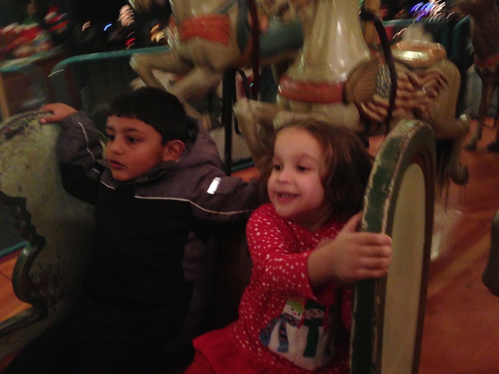 Here we are at our Annual Swim and Gym Get together over the Holiday;s at the Tilden Carousel. This place is so beautiful at Christmas Time, the decorations and the lights are lovely, and it is so neat to see all of the Christmas tree's decorated with unique themes, Star Wars, Hello Kitty, 1950's Robots, its super fun. There is a Santa there but that past year Holly has been to anxious to meet with any of the Santa's we saw, even when here friends did it and were Brave. But that's ok. We wrote him a letter. She loved riding around and around with her friends, especially the spinning seat, it was double twirling action, made me dizzy just to watch that. I had a kick using the Panoramic mode on my New iPhone 5, it was just too fun. If you click on the images, you should be able to check out some larger versions.